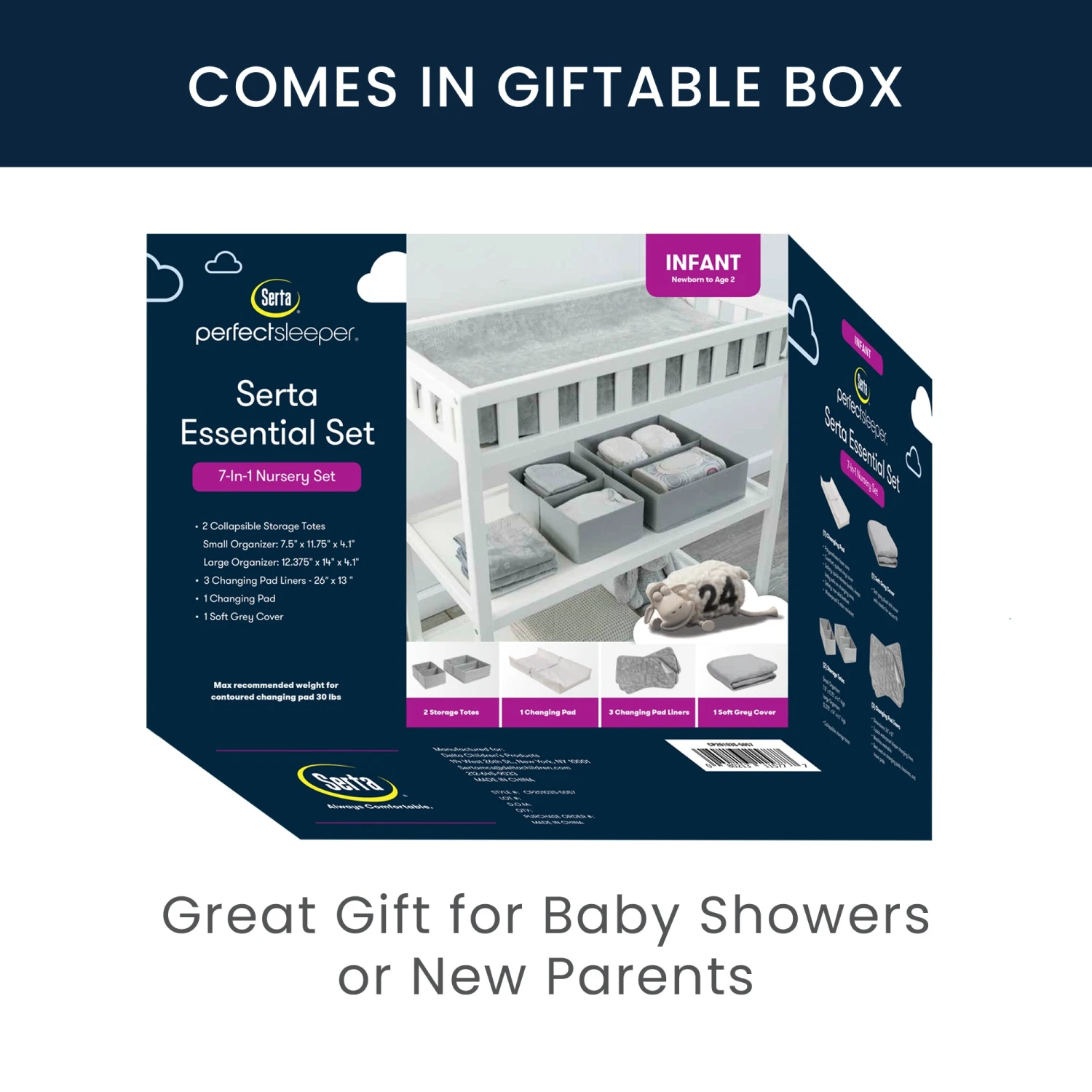 Create a cozy and organized place for your baby during diaper changes with this 7-Piece Essential Changing Table Set by Serta. This convenient set includes all the necessary items—a Changing Pad, Plush Changing Pad Cover, 3 Changing Pad Liners and 2 Storage Bins. The Changing Pad features a secure safety harness with a quick release buckle and a waterproof and hypoallergenic design that easily wipes clean. The Changing Pad Cover is machine washable and provides a plush, comfortable changing environment for your baby. Use the three Changing Pad Liners on top of the changing pad for an additional waterproof layer or use them as a portable changing pad for a soft changing surface while on the go. The included storage bins provide organization, allowing you to keep changing necessities within reach. Packaged in an easily giftable box, this 7-Piece Essential Changing Table Set is the ideal gift for baby showers or new parents.