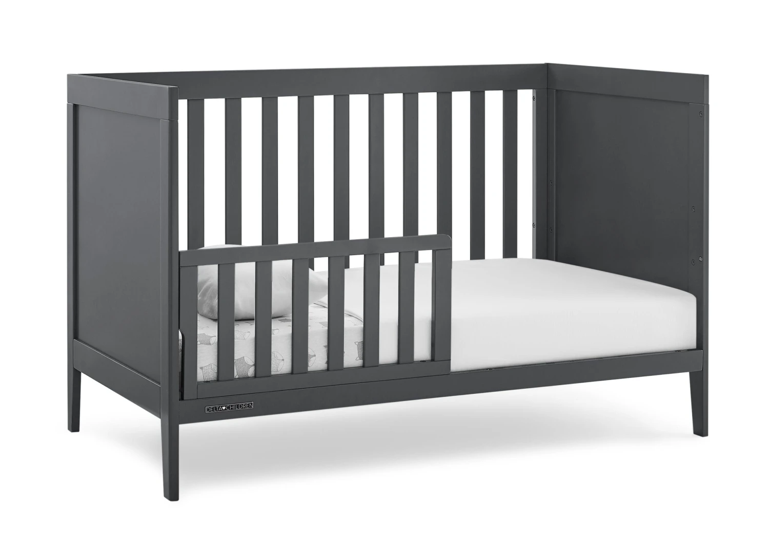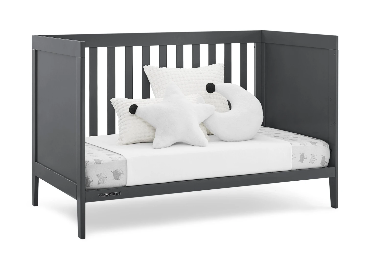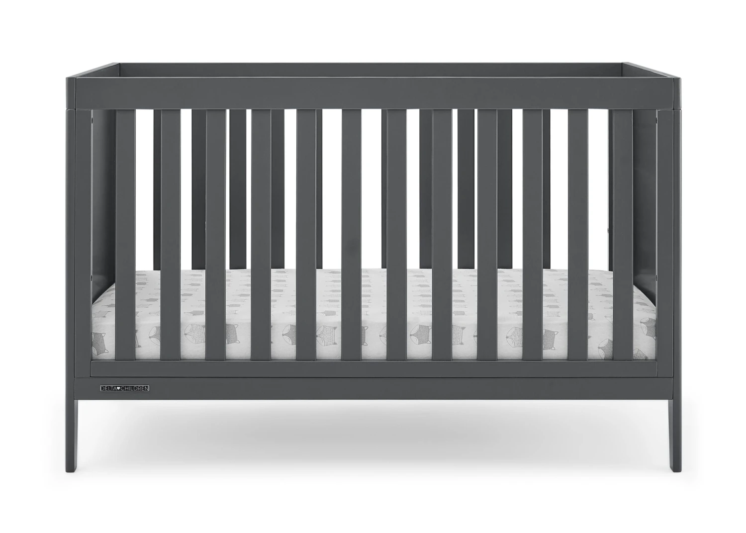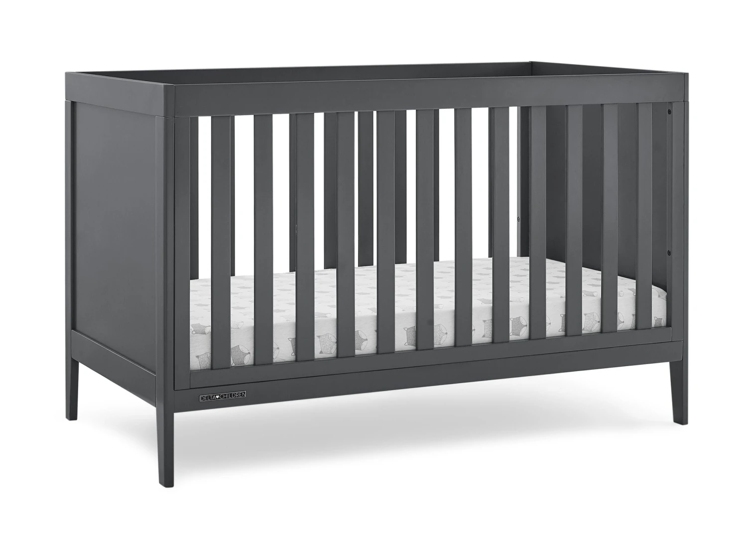 The Hayes 4-in-1 Convertible Crib by Delta Children raises the bar on style and responsible design with a modern silhouette and GREENGUARD Gold Certification, contributing to cleaner air in your home. Solid panels on both ends are set against painted slats. Crafted-to-last, this crib is designed for the baby years and beyond. The crib’s adjustable mattress support allows you to lower the mattress height as your baby grows. When your child is ready, its versatile design easily adapts from crib to a cozy toddler bed, daybed and sofa (Daybed/Sofa Rail included; Toddler Guardrail # W100825 sold separately). Available in Bianca White and Charcoal Grey. Coordinates with the Hayes Fabric Bin Changer and Hayes Rocking Chair.