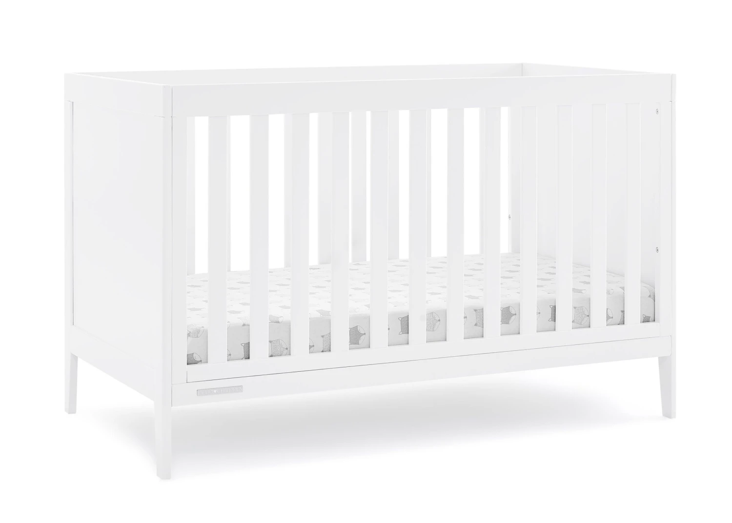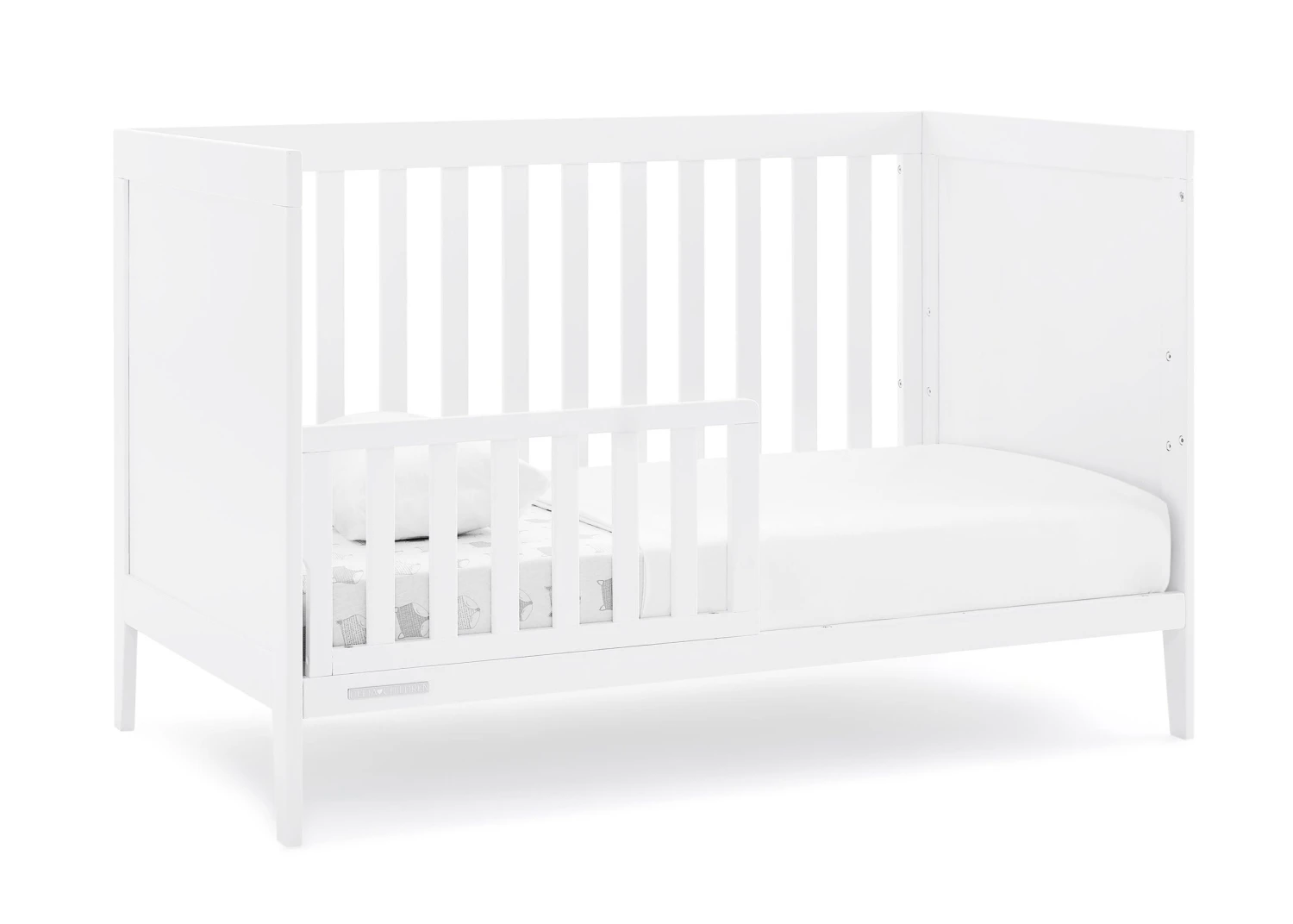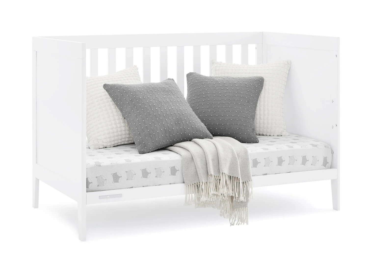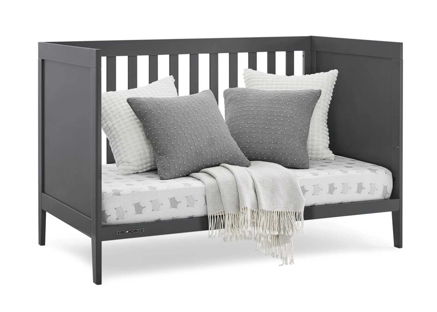 The Hayes 4-in-1 Convertible Crib by Delta Children raises the bar on style and responsible design with a modern silhouette and GREENGUARD Gold Certification, contributing to cleaner air in your home. Solid panels on both ends are set against painted slats. Crafted-to-last, this crib is designed for the baby years and beyond. The crib’s adjustable mattress support allows you to lower the mattress height as your baby grows. When your child is ready, its versatile design easily adapts from crib to a cozy toddler bed, daybed and sofa (Daybed/Sofa Rail included; Toddler Guardrail # W100825 sold separately). Available in Bianca White and Charcoal Grey. Coordinates with the Hayes Fabric Bin Changer and Hayes Rocking Chair.