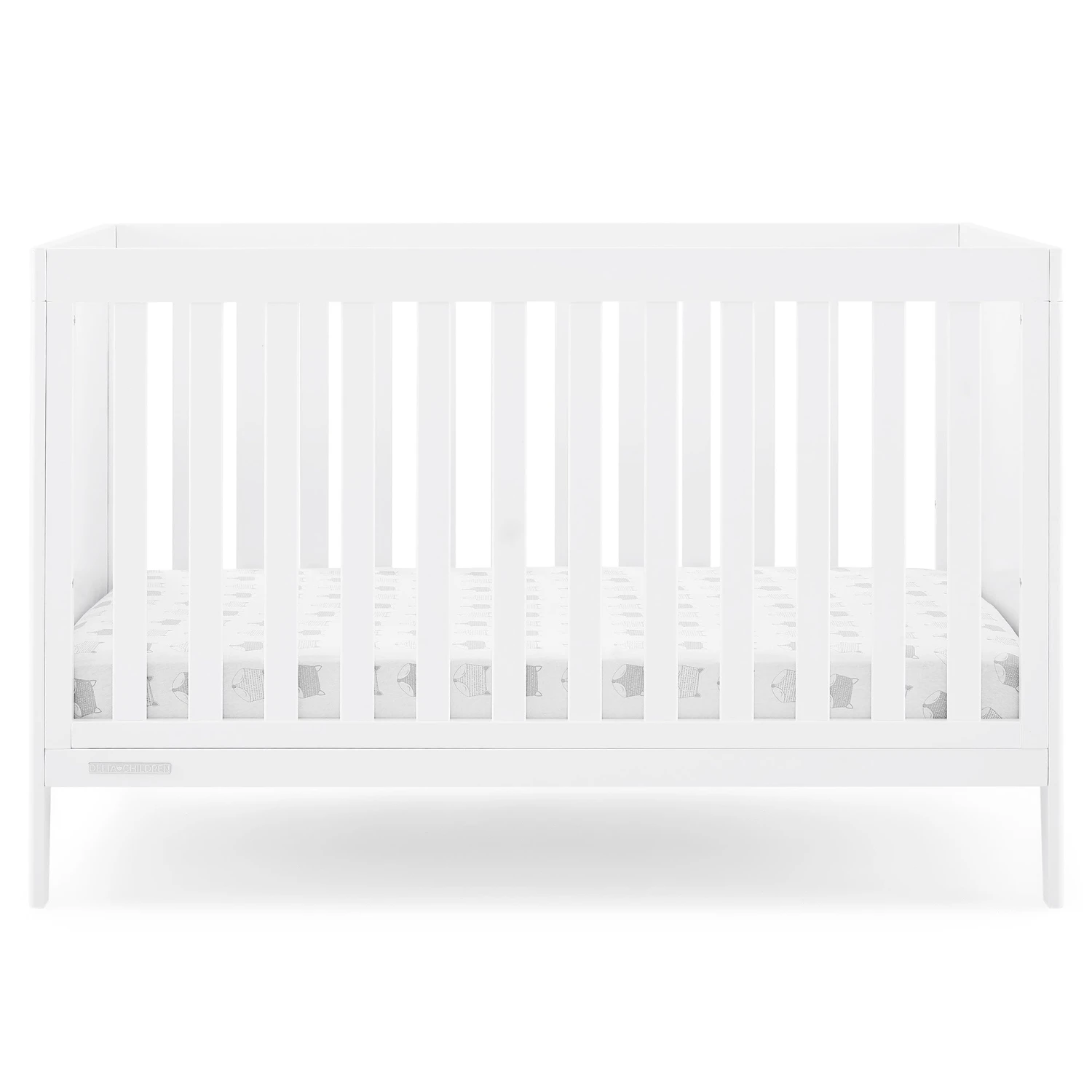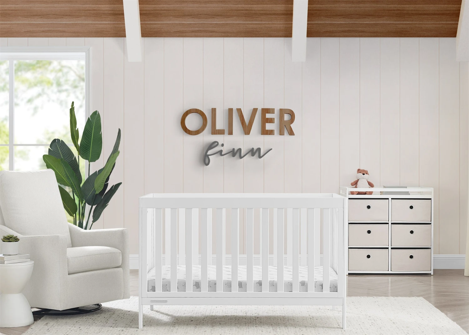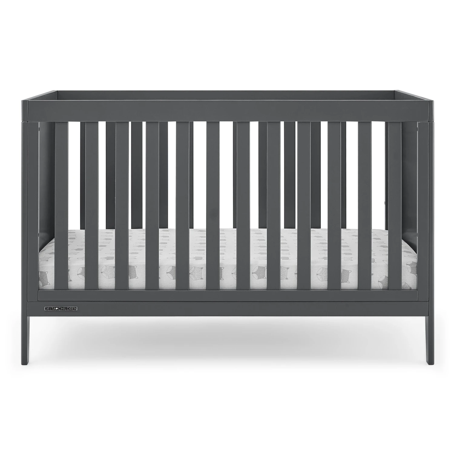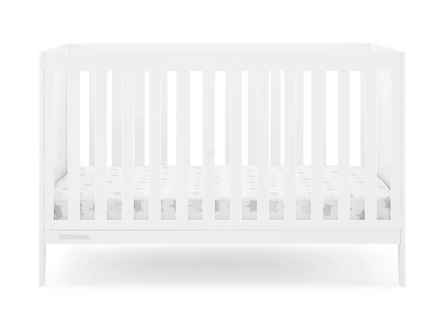 The Hayes 4-in-1 Convertible Crib by Delta Children raises the bar on style and responsible design with a modern silhouette and GREENGUARD Gold Certification, contributing to cleaner air in your home. Solid panels on both ends are set against painted slats. Crafted-to-last, this crib is designed for the baby years and beyond. The crib’s adjustable mattress support allows you to lower the mattress height as your baby grows. When your child is ready, its versatile design easily adapts from crib to a cozy toddler bed, daybed and sofa (Daybed/Sofa Rail included; Toddler Guardrail # W100825 sold separately). Available in Bianca White and Charcoal Grey. Coordinates with the Hayes Fabric Bin Changer and Hayes Rocking Chair.