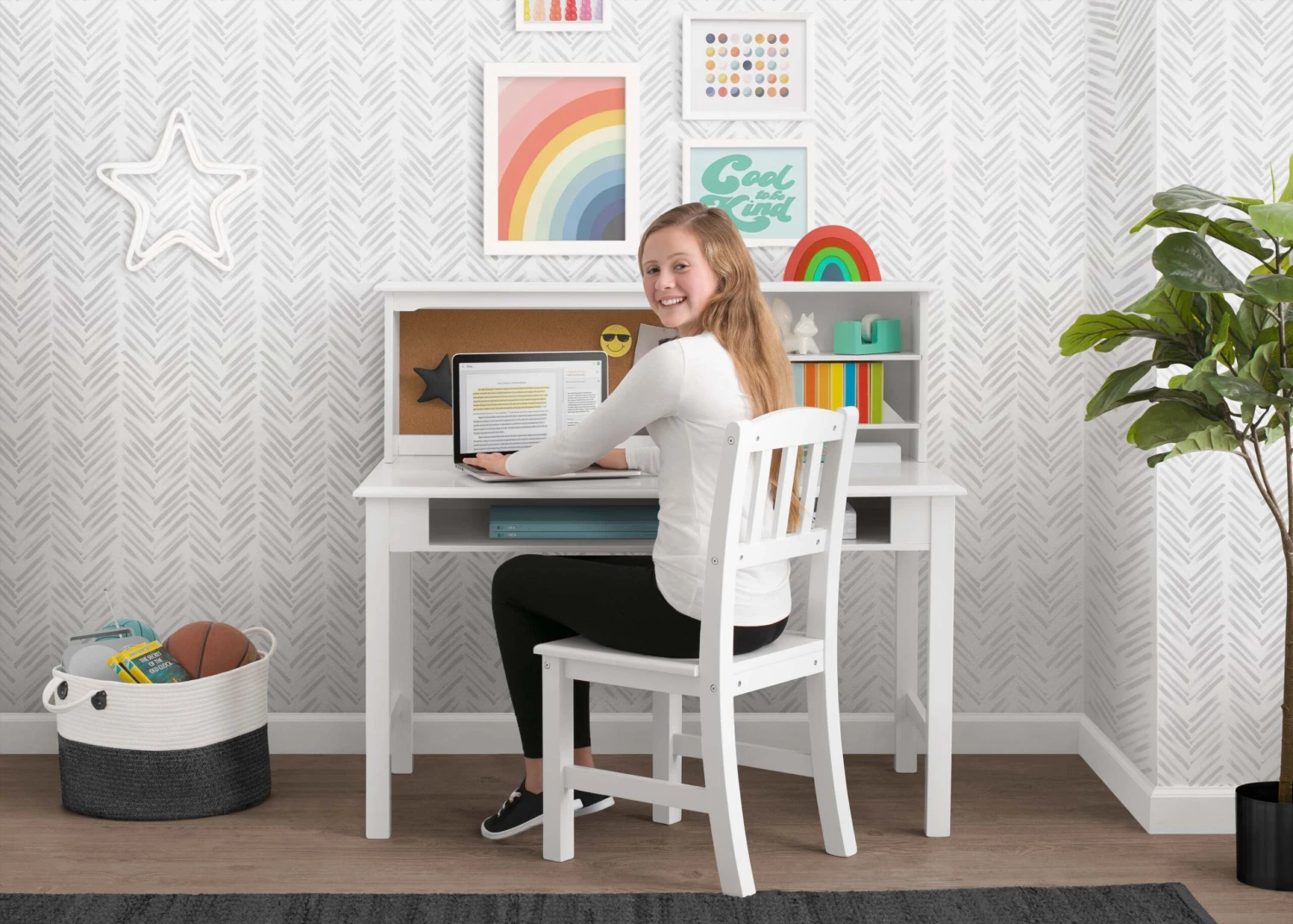Set the scene for studying with this Kids’ Desk with Hutch and Chair by Delta Children. Clean lines ensure this desk will look great with any decor while the ample storage makes it a versatile piece of furniture for your child’s bedroom. The desk features two built-in cubbies to store pencils, notebooks and more while the hutch features a cork bulletin board to hang important notes or artwork, adjustable cubbies and convenient cutouts to hide wires. The coordinating chair is the ideal size for your growing child. Recommended for children ages 5 and up.