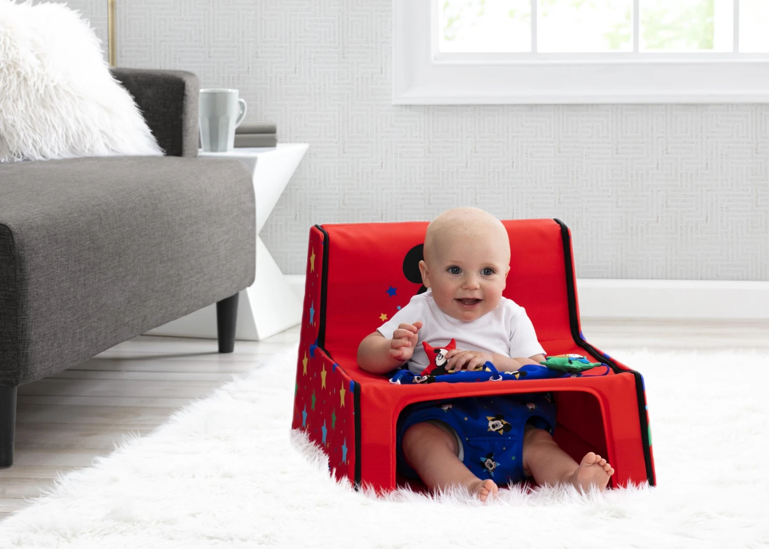The Disney Mickey Mouse Sit N Play Portable Activity Seat by Delta Children will encourage baby to sit, interact and play, at home and on the go. The supportive upright seat allows your baby to see and interact with world in absolute comfort. Your little one will love playing with the engaging Mickey Mouse-inspired toys that help increase gross motor skills, and you’ll love how easy it is to clean—just remove the seat pad and pop it in the washing machine. The rest of the activity seat features water-and-stain-resistant fabric that’s easy to wipe clean! Ideal for travel, this infant floor seat features an innovative zippered design and convenient carry handle—unzip to easily fold flat in seconds.