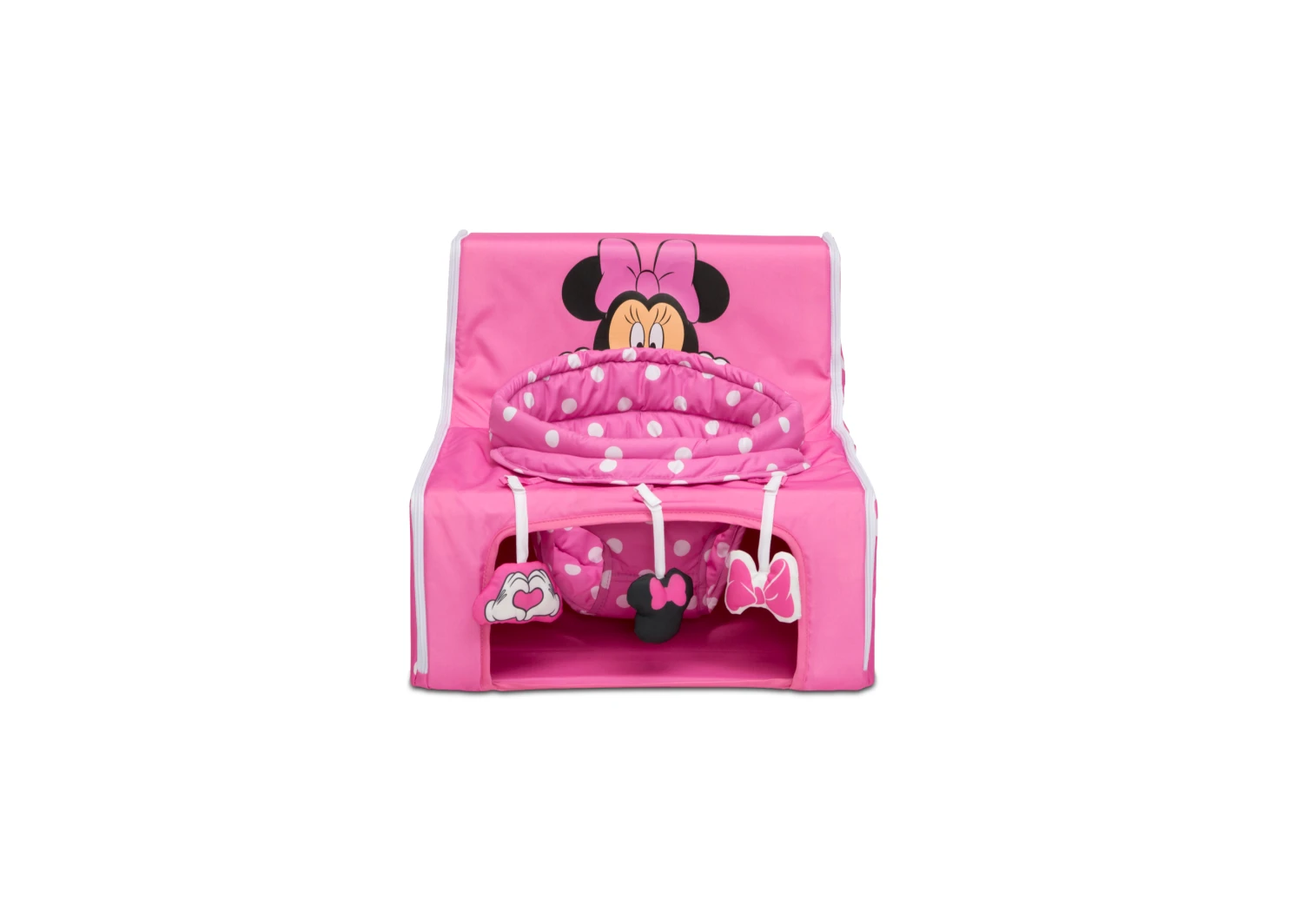 The Disney Minnie Mouse Sit N Play Portable Activity Seat by Delta Children will encourage baby to sit, interact and play, at home and on the go. The supportive upright seat allows your baby to see and interact with world in absolute comfort. Your little one will love playing with the engaging Minnie Mouse-inspired toys that help increase gross motor skills, and you’ll love how easy it is to clean— just remove the seat pad and pop it in the washing machine. The rest of the activity seat features water-and-stain-resistant fabric that’s easy to wipe clean! Ideal for travel, this infant floor seat features an innovative zippered design and convenient carry handle—unzip to easily fold flat in seconds.