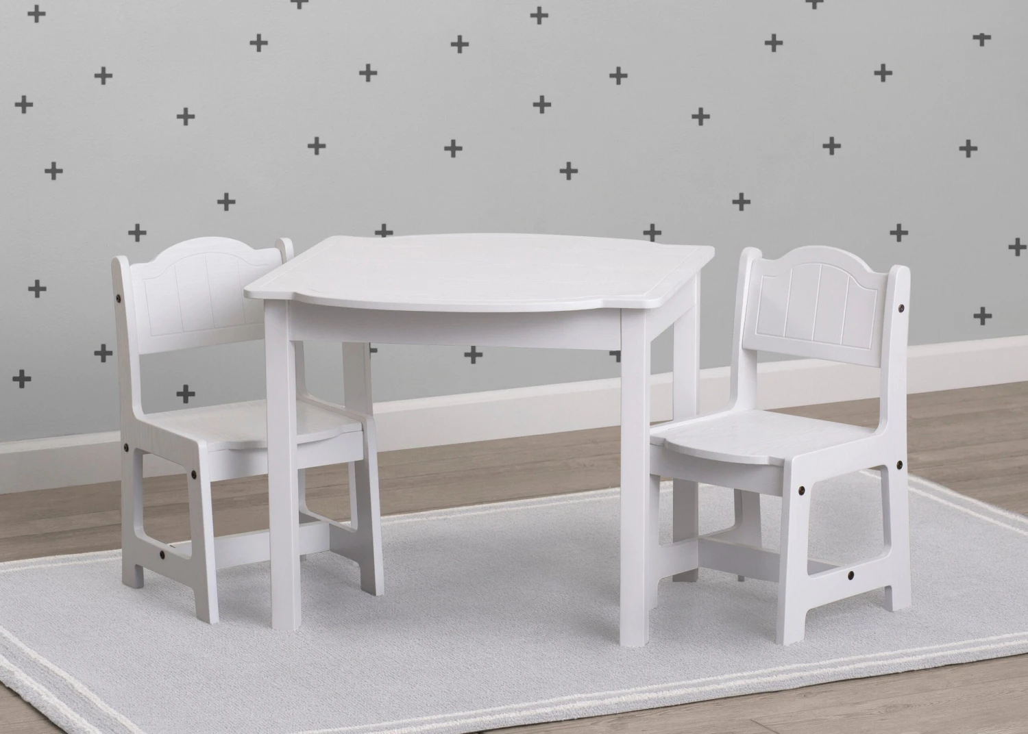 Create an inspiring place for young kids to play, learn or eat with the Newport Table and 2 Chair Set by Delta Children. Sized just right for your growing child, it will provide years of creative fun. The classic, elegant look of this wood table and chair set is inspired by costal charm with its gentle curves and shiplap-like paneling. Beautiful and practical, this set will complement existing bedroom, playroom or living room decor, which makes this set a piece you’ll be proud to display in your home. Coordinates with other items in the Delta Children Newport Collection.