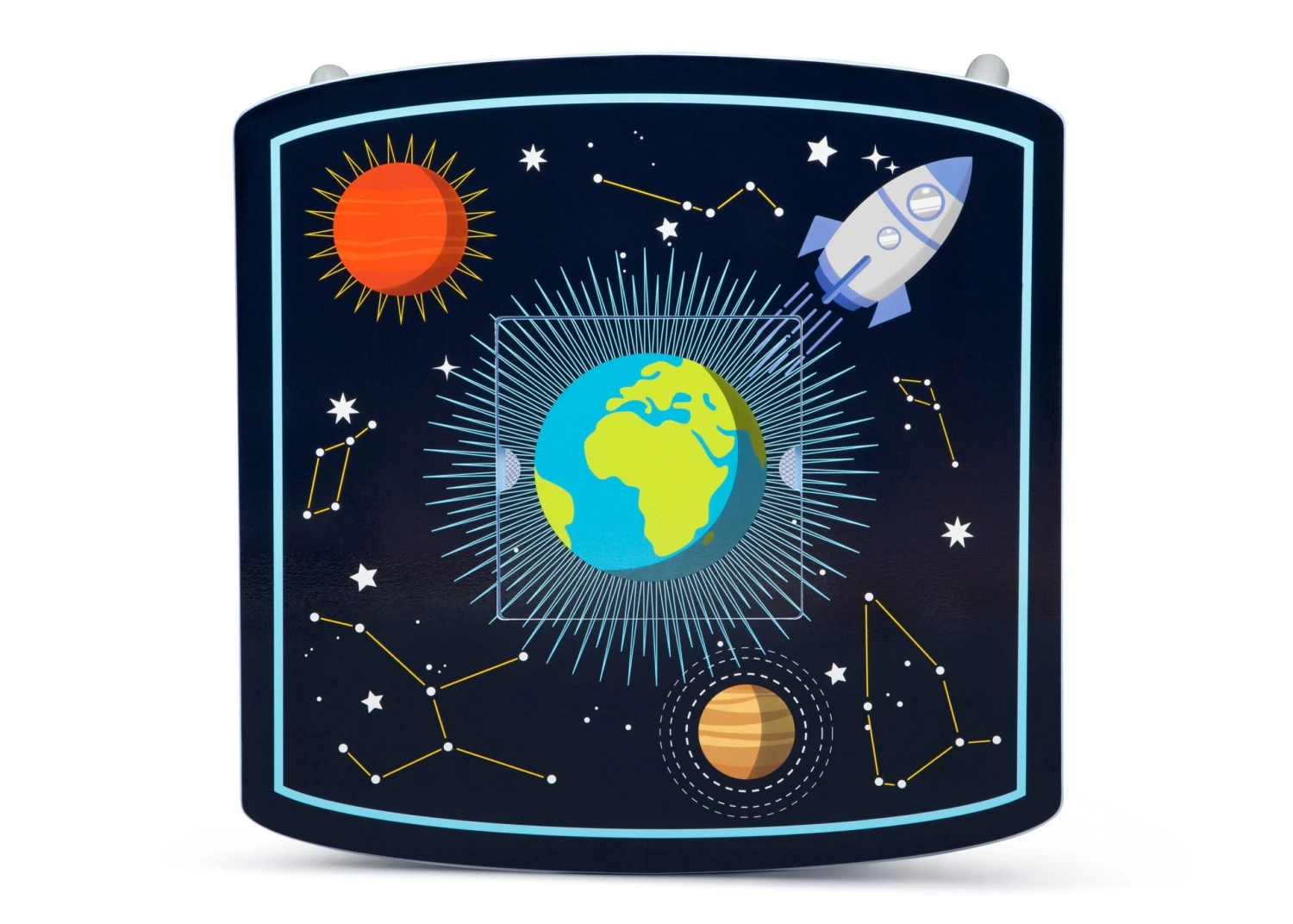 The Space Adventures Kids Table and Chair Set with Storage by Delta Children is the best table in the whole galaxy! Its intergalactic-inspired graphics of the solar system will have your little astronaut-in-training over the moon. Designed to be the ideal kid-sized height, this set features a sturdy table with storage in the middle and two coordinating chairs. A stellar addition to the living room, playroom or your child’s bedroom, the durable construction and quality craftsmanship of this set makes it the perfect place to do homework, art projects or eat. Spark their sense of wonder, and travel to the cosmos, with the Space Adventures Kids Table and Chair Set with Storage by Delta Children, today! Pair it with other items in Delta Children’s Space Adventures collection for a galaxy-themed bedroom.