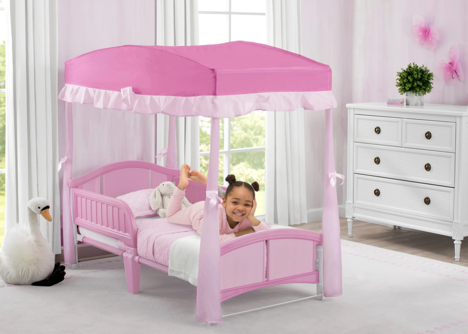 Transforming your girl’s bedroom into a kingdom fit for a royal is easy with Delta Children’s Toddler Bed Canopy! Trimmed with ruffles and fabric held in place by ribbon bows, it sets the scene for a whimsical sleep space. Simple to set up, the four plastic poles attach to most standard size toddler beds, and make bedtime so much more magical.