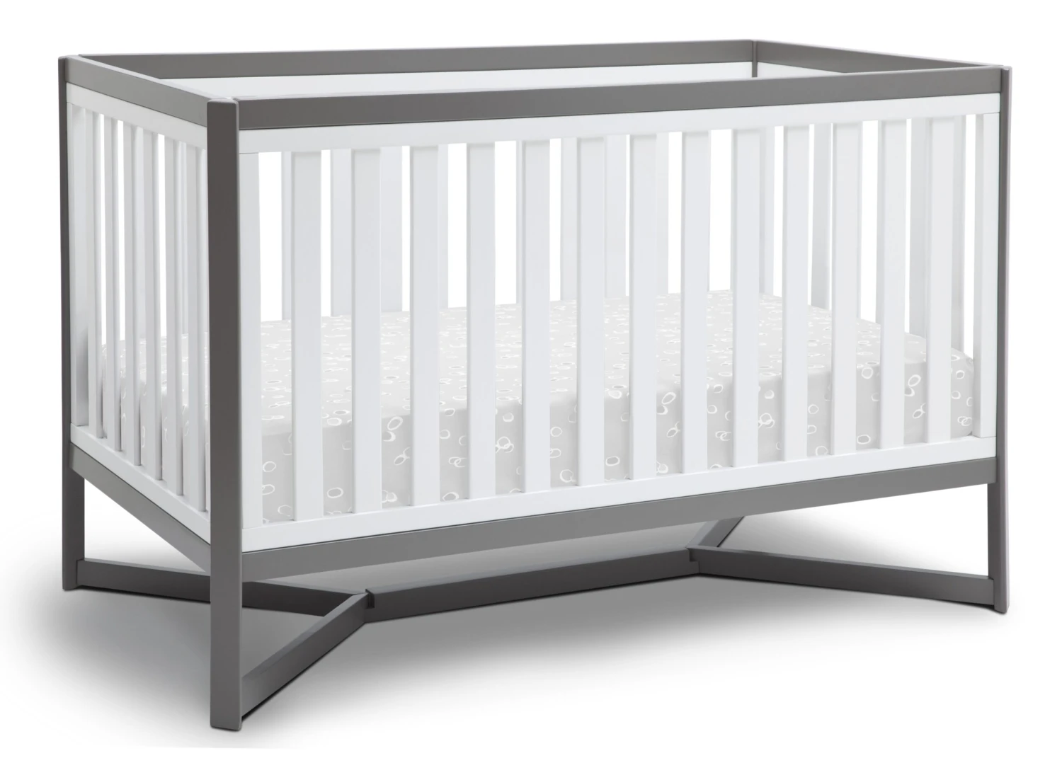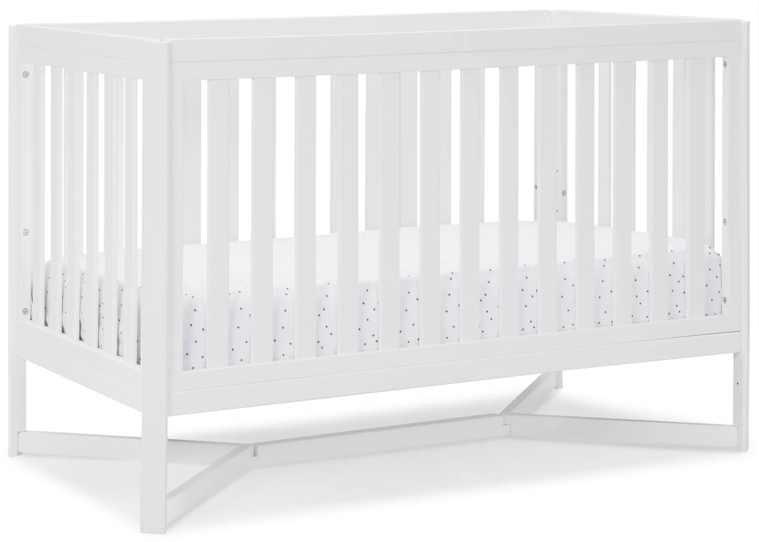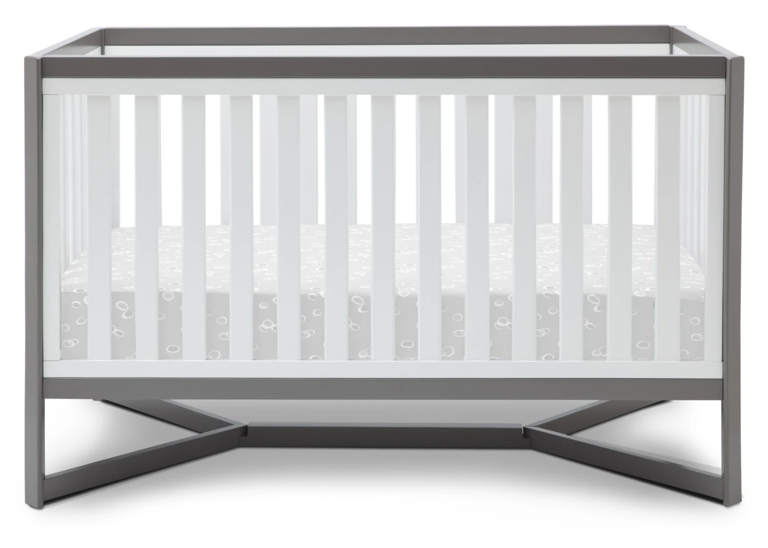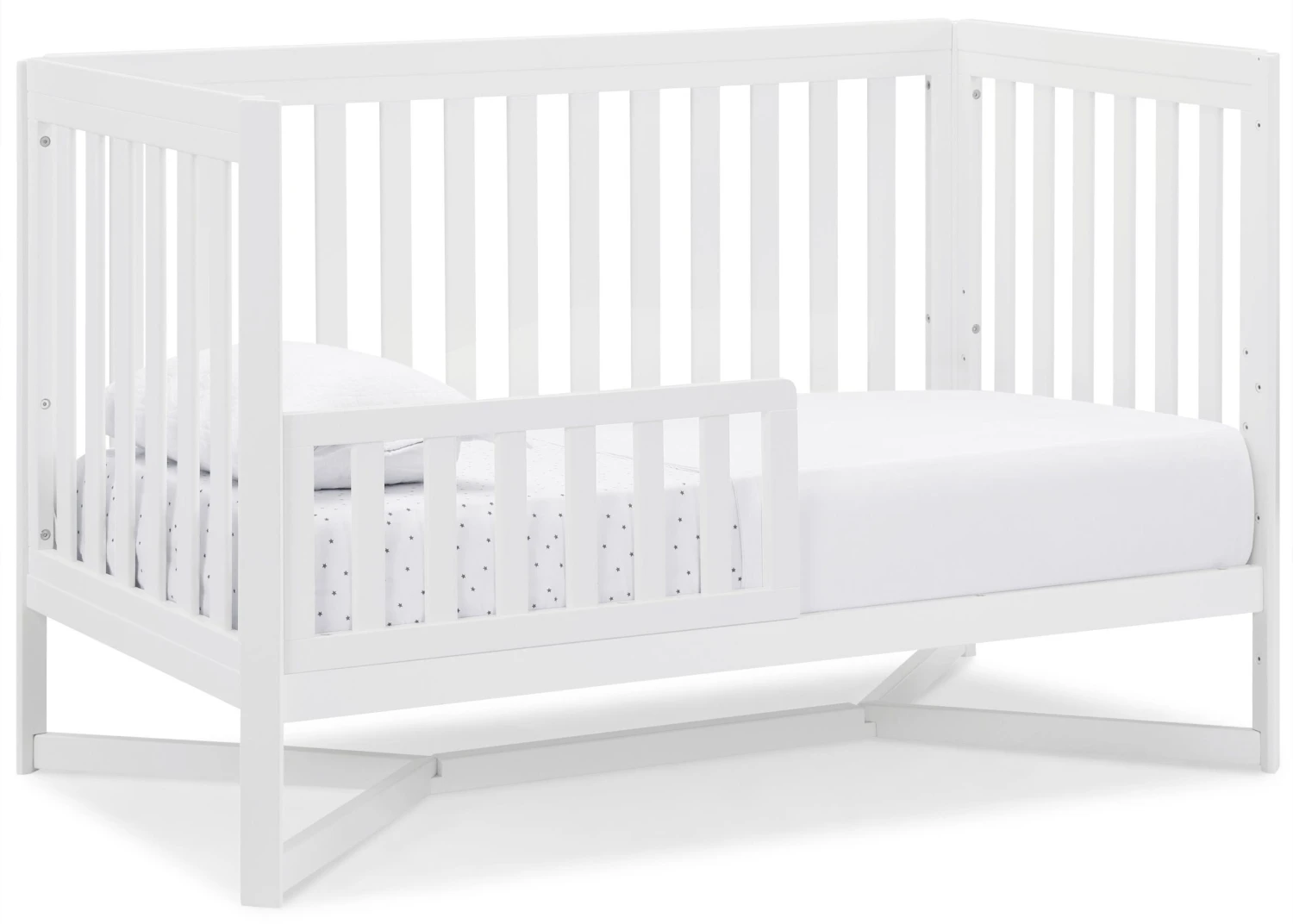 Designed to be the centerpiece of your nursery, the Tribeca 4-in-1 Convertible Crib by Delta Children exudes contemporary cool. Featuring plenty of modern touches it boasts a sleek x-shaped base and airy slats. Crafted from strong and sturdy wood, this crib features three height levels, and converts to a toddler bed, daybed and full size bed, making it the only bed your baby will every need. Toddler Guardrail #0080, Full Size Wood Bed Rails #0050 or Full Size Metal Bed Frame #0040 sold separately.
