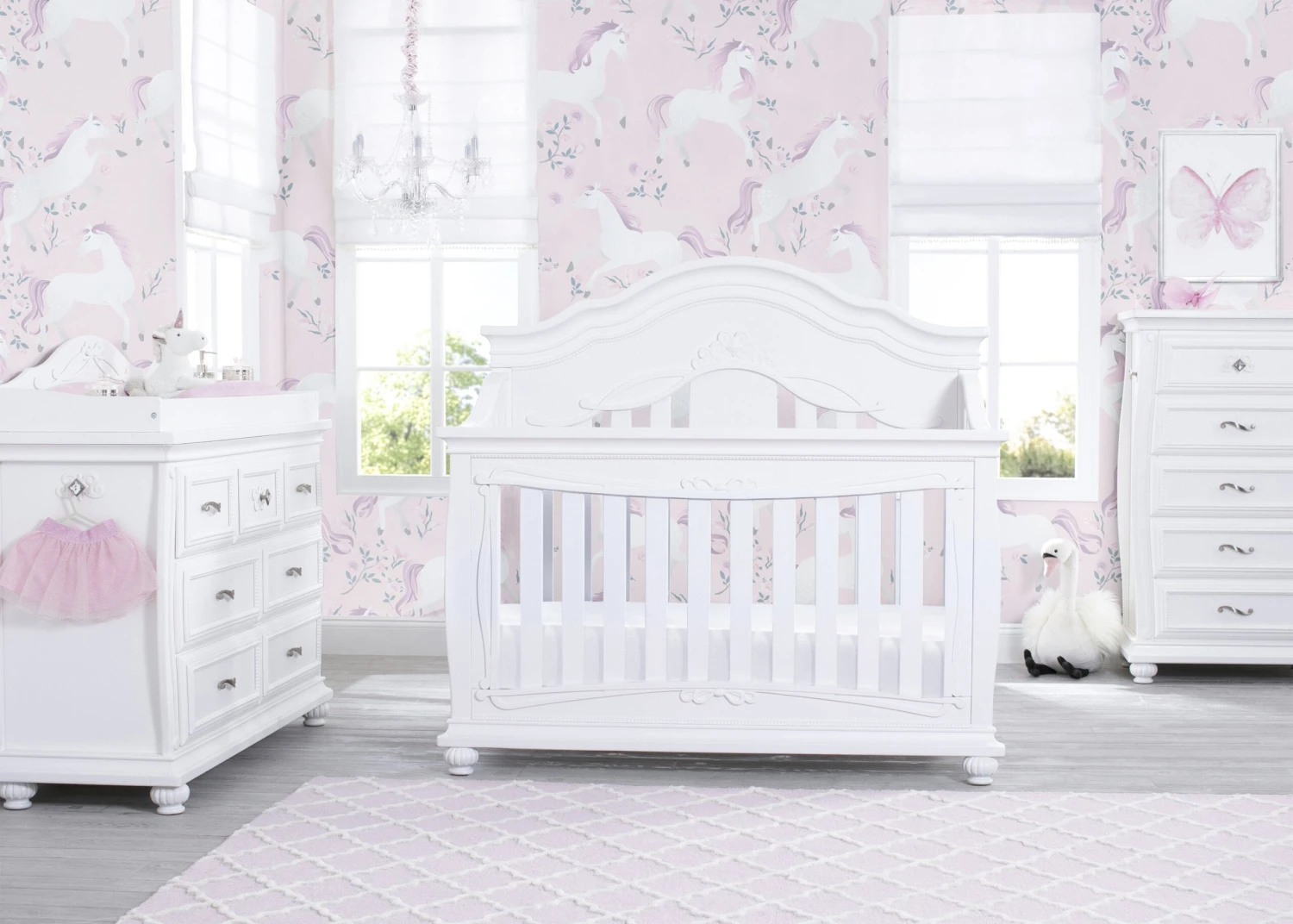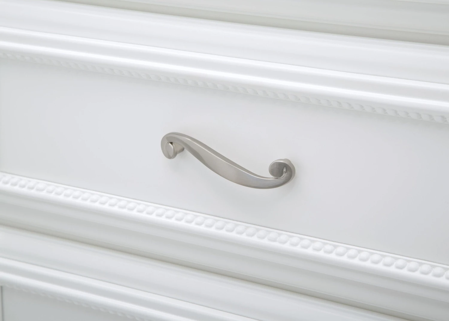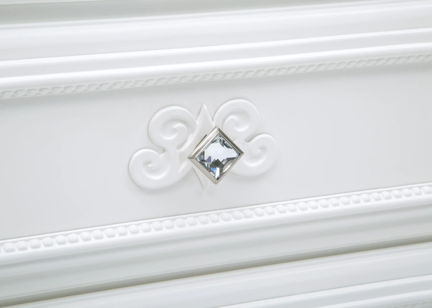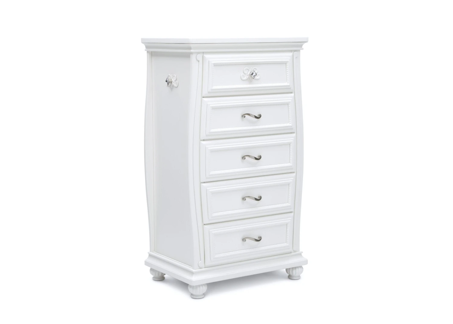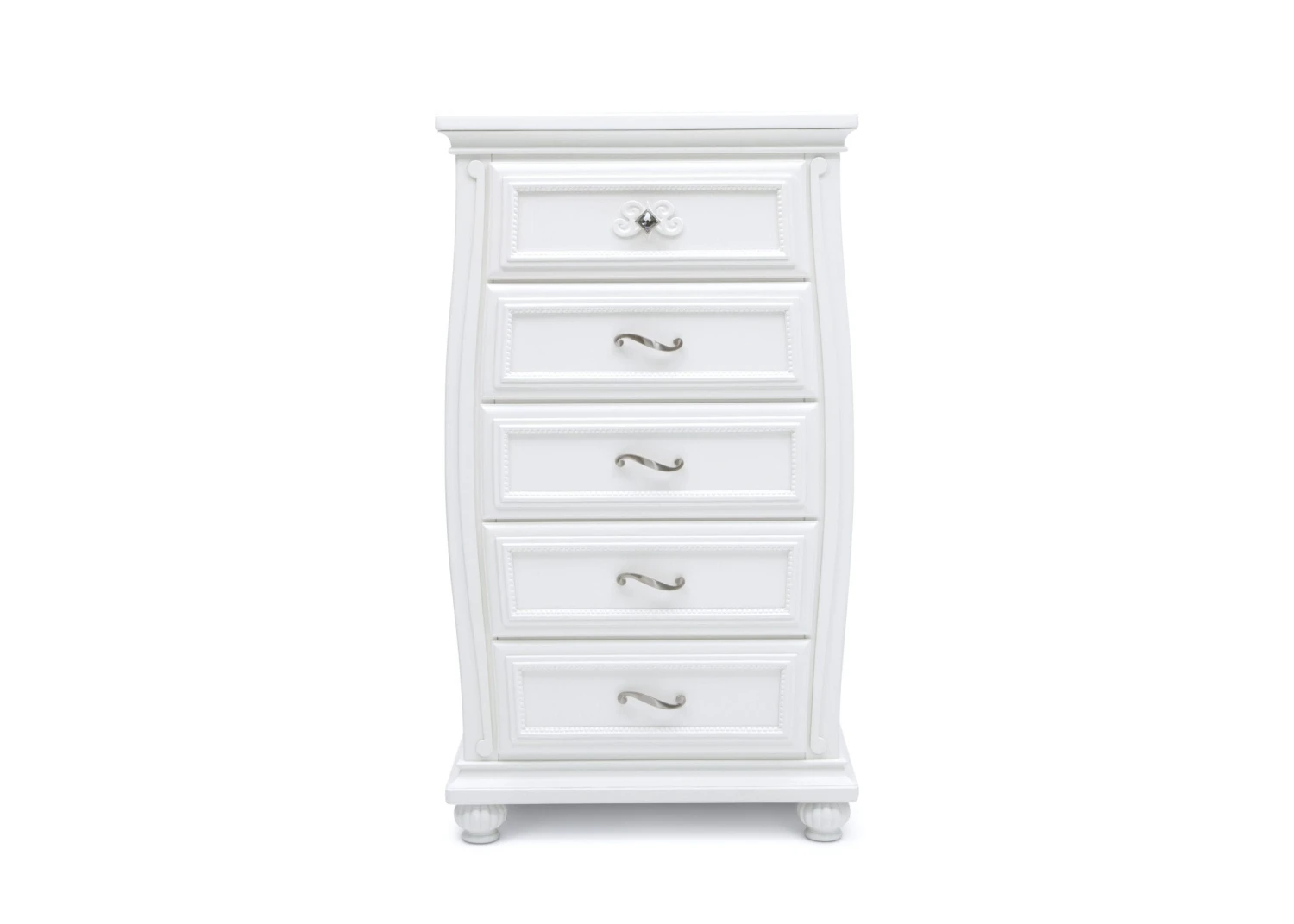 The Fairytale 5 Drawer Chest by Simmons Kids will be the crown jewel of any bedroom. Its exaggerated silhouette features curves inspired by the classic bombé shape for a whimsical touch while intricate carvings and bun feet balance the look. Five sliding drawers with swirl-shaped satin nickel pulls open to reveal a wealth of storage within. Acrylic knobs on each side of the chest provide additional storage space to hang accessories, like necklaces or headbands. To complete your bedroom or nursery, pair the Fairytale 5 Drawer Chest with coordinating items from the Simmons Kids Fairytale Collection.