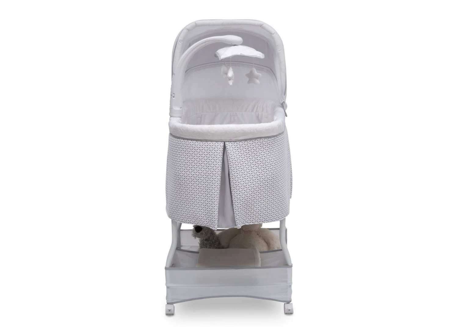 Help ease your baby to sleep with the automatic gliding motion, soothing sounds, spinning star toys, twinkling lights and soft-glow nightlight on the Serta iComfort Auto Gliding Bassinet. Activate the bassinet’s whisper-quiet gliding motion with a push of a button—the smooth sway creates a serene sleep space. The modern grey and white pattern on plush fabrics will be at home anywhere, from the nursery to the family room and the parents’ bedroom. Locking wheels, a light blocking canopy and foam mattress pad means your newborn can sleep by your side, no matter where you are in the house. Plus, the removable fitted sheet is machine washable for easy care. Brought to you by Serta, the leader in mattress innovation and technology, this bassinet will make it easier than ever for baby to fall asleep and stay asleep throughout the night. This bassinet is recommended for babies 0-5 months. Stop use at 5 months or once your infant begins to push up on their hands and knees, whichever comes first. Use the included AC adapter for battery free operation.